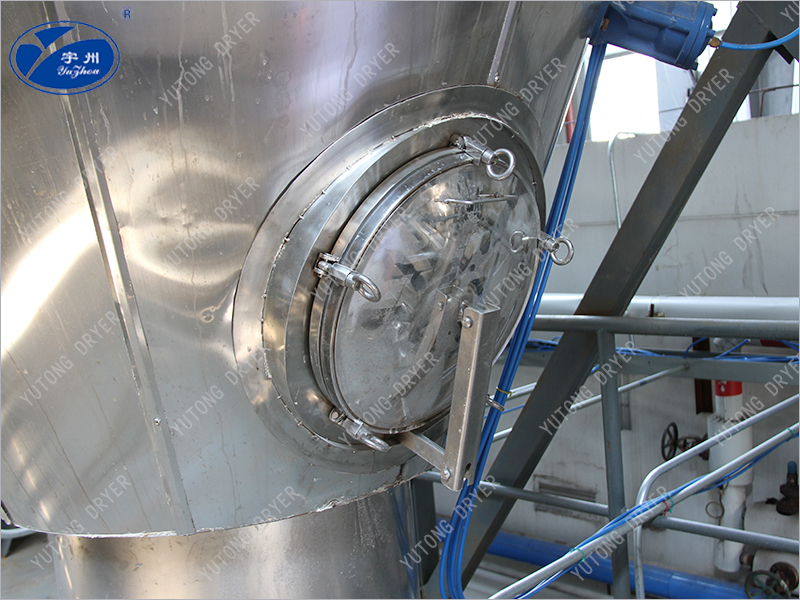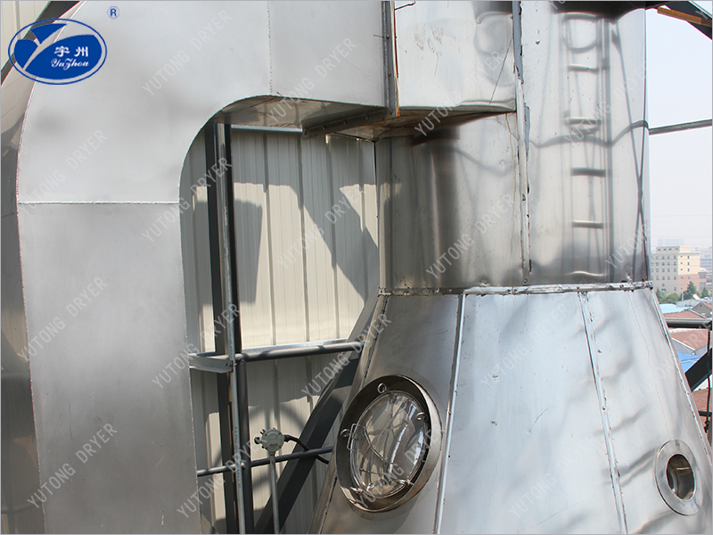 空氣通過濾清器進入加熱器,交換成熱空氣,進去干燥室頂部的熱空氣分配器,使空氣均勻呈旋轉狀或平行軸線進入干燥室。料液需經過篩后由高壓泵送至設在干燥室頂中心的噴嘴,將料液均勻的霧化,使液滴的表面積大大增加,與熱空氣相遇接觸,使水份迅速蒸發,在極短的時間里干燥成為顆粒產品,大部分產品由設在塔底部出料口收集,廢氣和微小粉粒經旋 風分離器分離,成品由旋風分離器下端收集筒收集,廢氣由抽風機排出。